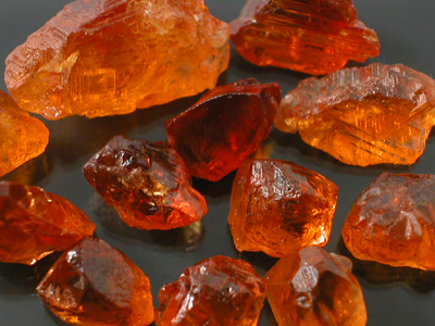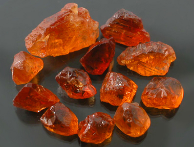 Fanta to Mandarin Orange Spessartite Garnet Faceting Rough from a fairly new discovery in Kunar, Afghanistan. You can read our write-up for this material in the Fall 2004 issue of GIA's Gems & Gemology. This material closely resembles the Namibian and better quality Nigerian Mandarin Spessartite Garnet seldom available in the market; however, many of the stones have a VERY subtle Peach overtone unlike anything we have seen before. Since all Afghan finds are from Primary Deposits almost all of these stones show Crystal faces or natural etching with many showing high external luster. Many of these are nice chunky Crystal Sections with a bright Mandarin Orange color for the most part. This lot is composed of mostly select rough and most stones in here will produce Eye-Clean to very slightly included finished gems with a little planning and hard work. A few stones do have minor inclusions but we are confident you will take out a stunning finished gemstone from practically every one of these! Our price on this is better than most Nigerian and Namibian dealers for like quality material and we are confident that this will make any experienced Mandarin Garnet connoisseur VERYYYYY happy. Production at this mine is VERY VERY limited and it truly is a miracle that we can offer this material at all! |