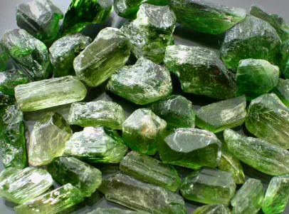 Great lot of Pakistani Diopside running from an almost Deep Peridotish Green to a Chrome and Hunter Green in color with some cool Bicolor Combinations! This is really lovely material and cuts some magnificent stones. We have offered this in the past; however, we never saw it again in the market until our recent trip to the market. Most of these stones will cut eye-clean to slightly included finished stones at best; however, many inclusions mask up well and these stones cut with great face up appeal. I have seen people selling this material as Top Facet Grade, unfortunately this in reality is not Top Facet Grade as most pieces will not cut flawless stones though quite a few stones in the parcel are Top Facet Grade the parcel as a whole is not. Top material is RARELY produced in Pakistan and these are some of the cleanest stones we have ever come across. We estimate that approximately 60%+ of this material is a mixture of medium to high grade facet rough and the remainder has some excellent material for Cabbing and potentially additional Facet Rough. These are nice large chunky pieces with the average weight being over 7.5 carats! |