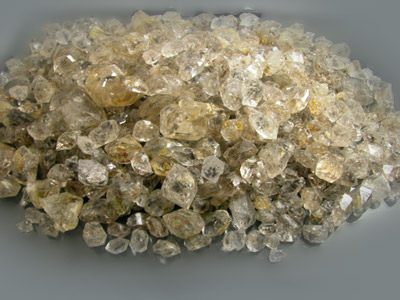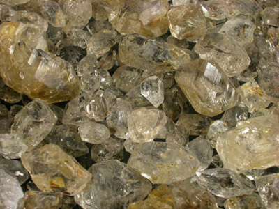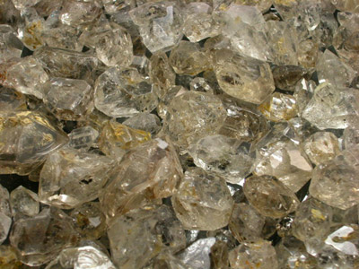 This is a NEW FIND of Quartz coming from Pakistan and is being referred to as "Diamond Quartz" in the local markets where it is sold. This material is extremely similar to Herkimer Diamond with a cool new twist. Many of these stones have wild black and/or liquid inclusions! Some of these look like they are three phase inclusions and have a solid, liquid and gas combination clearly visible to the naked eye while others look almost like insects! Some of these inclusions show up as a light yellow while others are clear. Local sellers are saying that the Black inclusions are Carbon and the Yellow and Liquid Inclusions are Petrol or Gas. We have heard of this Quartz referred to as Hydra Quartz and some have referred to the inclusions as being composed of water. Whatever these inclusions are composed of this material is selling out here at a phenomenal rate. I have been told that some of this material fluoresces under UV light; however, I don't have any UV light to test it so there are no guarantees on it. This is the second type of Quartz that was found in the region it is being mined and the first material started out at about $20.00 a kilo out here and peaked at about $500.00 per kilo before the mines were exhausted. Now the old material is no longer being produced and the price has been climbing higher and higher for it. I think this is a great investment lot as you really can't go wrong with the price on this. There is a very limited amount of this in the markets in Pakistan and it has already begun to climb in price EXTREMELY quickly. Many of these are excellent examples of Fadden Quartz that Pakistan is well known for with quite a few exhibiting new features unseen before. There are new black inclusions and weird internal etchings located inside the Quartz crystals. This material really shouldn't be faceted as it is a hot collectors item; however, I think faceting a stone with a three phase inclusion in the center would probably just blow people away! Please note that most of these are crystal sections having perfect razor sharp termination at both ends and SUPER luster. The cleaner material looks virtually identical to Herkimer Quartz while the included material is definitely worth picking this lot up for! |
